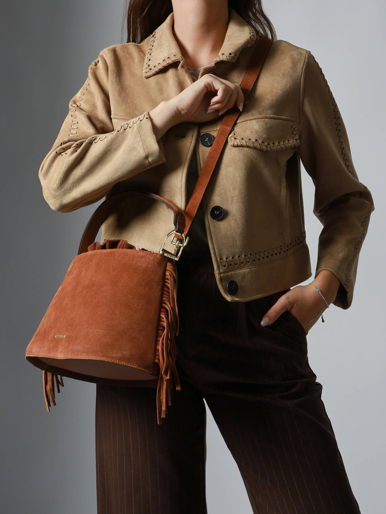 Le sac bandoulière ETRIER de la ligne COUNTRY est un sac seau en cuir velours à la forme trapèze originale. Il se ferme grâce à un pochon en tissu doté d’un cordon. Ce pochon est fixé au fond du sac par une pression pour plus de maintien. Il se porte à la main grâce à sa poignée ou en travers du corps grâce à sa bandoulière. Les franges ornant les côtés apportent une touche de mouvement et de liberté à ce modèle. Le dos du sac, réalisé en cuir lisse, offre une meilleure tenue. Un bijou en forme d’étrier vient sublimer le côté de la anse, ajoutant une signature raffinée à l’ensemble. COUNTRY capture l’essence d’un style libre et élégant, mêlant textures authentiques et dynamique naturelle, pour une allure parfaite en hiver.