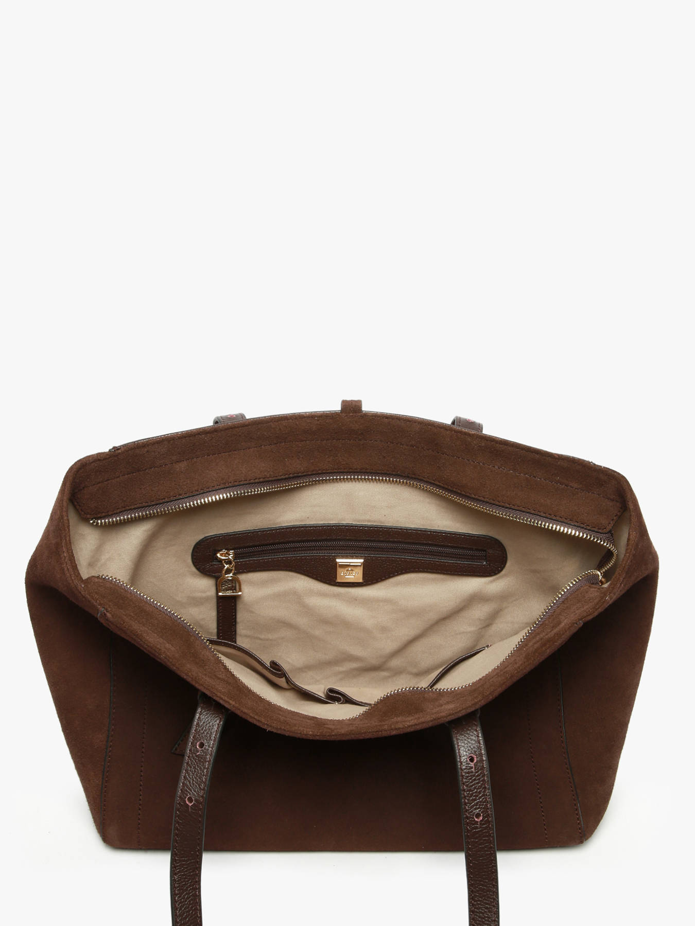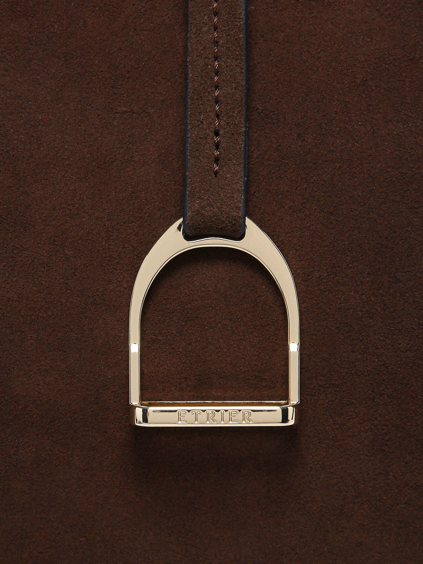 Le sac porté épaule ETRIER de la ligne ALTESSE SUEDE est réalisé en cuir velours au toucher doux. Il adopte une forme cabas idéale pour un usage quotidien. Il se ferme à l’aide d’une fermeture zippée et est orné d’un pendentif bijou en forme d’étrier, signature élégante de la Maison. À l’intérieur, un compartiment spacieux accueille deux poches plaquées et une poche zippée pour une organisation optimale. Il offre également un format généreux permettant d’y glisser des documents au format A4 ainsi qu’un ordinateur portable jusqu’à 13 pouces. Le dos du sac est en cuir grainé, pour une meilleure résistance. La ligne ALTESSE SUEDE revisite l’icône ETRIER avec une texture chaleureuse et un esprit « Highlander Cowboy » mêlant raffinement et caractère.